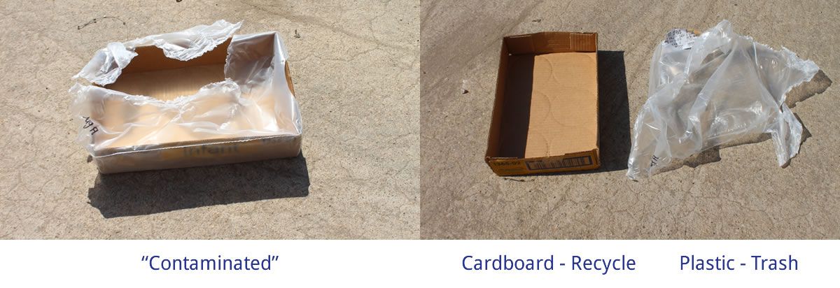 Putting cardboard wrapped with plastic in the recycling bin is considered a “contaminated” item. Please separate. Cardboard goes in recycling, plastic goes in trash.